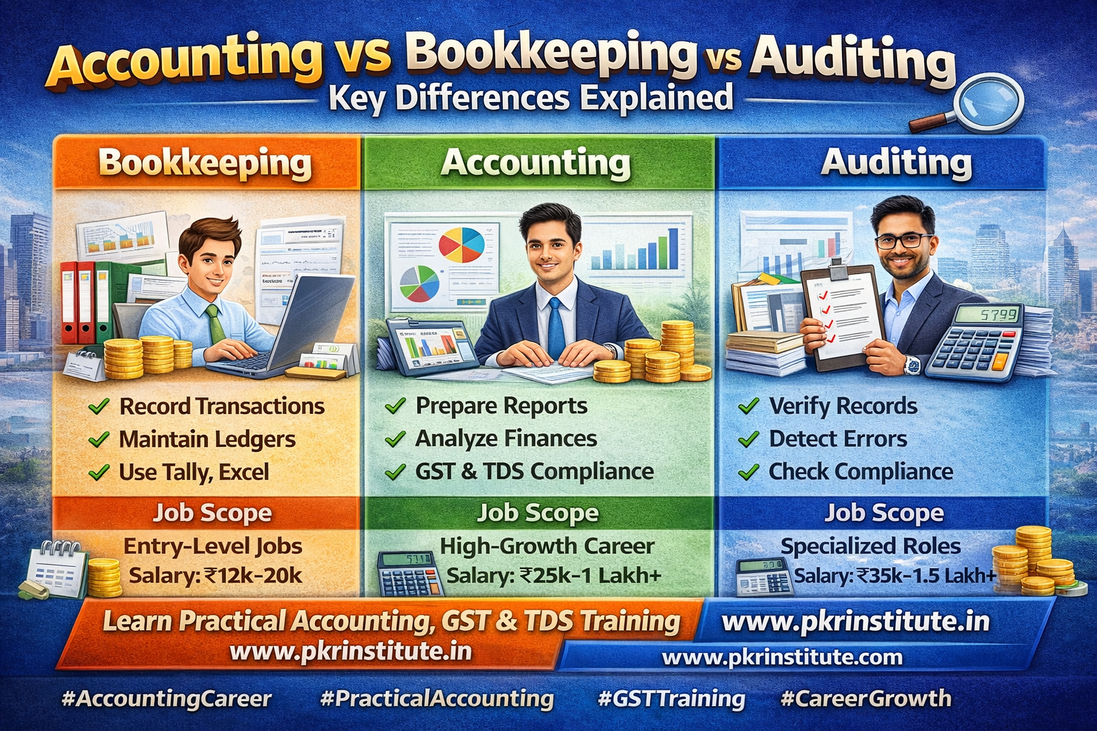 Moreover, companies clearly define these roles while hiring. As a result, knowing which skill belongs to which role can significantly improve your job opportunities. In this article, we will explain accounting vs bookkeeping vs auditing in a simple, practical, and career-oriented manner.